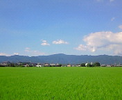 | 田んぼの緑が綺麗です♪ 本当はあそこの山にアタックしたかったんだけどね。 まぁ〜山は逃げないから次回にでも・・。(^^;; |