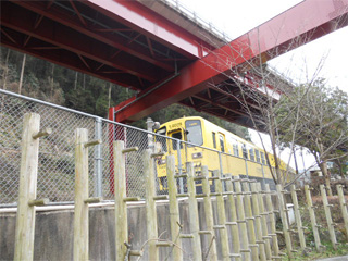 饅頭食ってると、ちょうど電車が到着。 2両編成でディーゼルでした。 ココは久留米と大分を結ぶ久大本線ですね。 上を走ってるのは国道R210号線です。 |