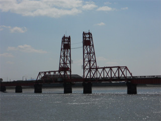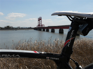 サドルと昇開橋のアングル♪ ってか、今日は風が強くて自転車を立てられない。(爆 (自転車を手で固定しての撮影です。) |