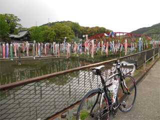 | 川上峡の淀姫神社前には 沢山の鯉のぼり♪ 川面に映って、その数も2倍に 見えますかね?(笑 しかし、ココから雨が降り出し、 気分も最悪!(-o-) ウェット路面でのポタリングとなってしまったのです。 |