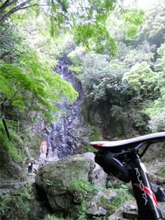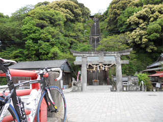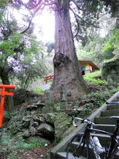 | 神社の鳥居やら、古木がいくつもありました。 写真の古木はスギだそうです。 へへへ・・ハクション!(>_<") 花粉シーズン終わってて良かったです。 しかし、ココで自転車で行くのを断念。 戻って別ルートで清水の滝を目指しました。(苦笑 |
