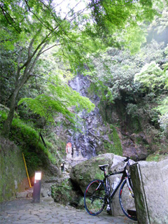 | 近くに「清水の滝」があるとのことで、 県道44号線を上ってみた。 薄暗い入り口。 階段が少々あったので担いで中に 入ってはみたものの・・・・ |
