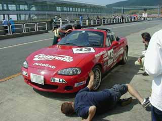 緊急ピットインのクロスレシオ・ロードスター。 この車両は富士フレッシュマンレースの 参加車両らしい・・・。 ほとんどノーマルです。 |