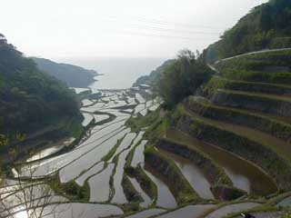 | 浜野浦の棚田です。 唐津の隣の玄海町にあります。 ※玄海町=原子力発電所があるところ 水田には水が張ってありました。 この辺は既に田植えシーズンみたいです。 夕陽が有名で、一眼レフ持ったカメラマンが 沢山、スタンバイしてました。 夕陽の時間まで3時間くらいあるのに・・。(@_@) |