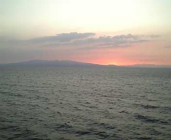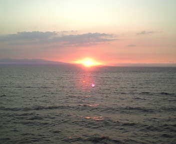 | ちょうど日没タイムで太陽が沈みます。 海の上から、日没を見るのは生涯はじめてかも? |