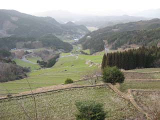大平展望所からの眺めです。 田んぼシーズンではありませんが、 棚田は雑草がうっすら生えていて、 黄緑色になってました♪ う〜〜・・・。 やっぱ、こうしてみると 黄砂が凄いっすね。(苦笑 |
