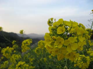 | 菜の花のド・アップ! 後ろの景色は黄砂のせいで霞んでます。(^^ゞ 今日も一眼カメラは持ってこなかった。(苦笑 |