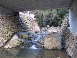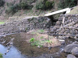 ”棚田の湧き水”って看板の方に向かうと 川のせせらぎを発見! 綺麗な水ですね。 八幡岳に降った雨水が棚田から湧いてくるのかな? |