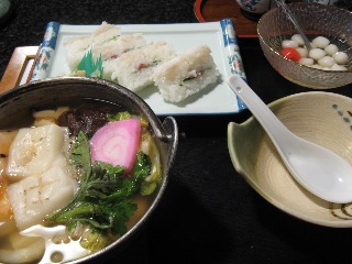 | オーダーしたのは、「カンバずし定食」1350円也♪ 1.カンバずし ふぐの湯引きをネタにしたにぎり寿司。 2.具雑煮 写真左側。モチが入ってます。少々焼いてあって 香ばしかったですが、モチの味の方はちょっと・・・・(苦笑 3.寒ざらし・・・写真右上。あんみつに使ったお団子。 夏に食べればひんやり美味しかったかも? 以上、島原名物のフルコースでした♪v(*'-^*)bぶいっ♪ |