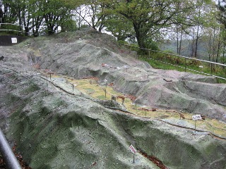 | 田原坂のジオラマ模型も 屋外に作られてました。 ”なぜに田原坂が決戦の舞台となったのか?” あの加藤清正公が熊本城を作った際、 天然の要塞として田原坂の道を作ったそうです。 大砲を運ぶルートは、当時この田原坂しか なかったそうです。 官軍も薩軍が包囲してるのを承知の上で 戦を挑んでいったようです。 |