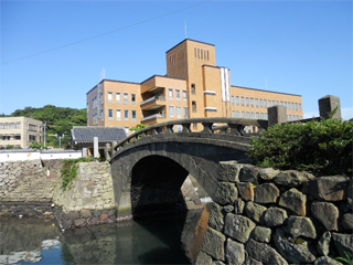 | 上の「ベイリーフ」の傍に 『幸橋』とよばれる橋があったので記念撮影♪ 橋の向こうの建物は平戸市役所です。 |