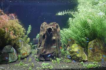| 202日目(10/17) 吸込み口フィルター清掃。 ガラス面のコケを除去後、1/2程度の換水。 PSB(濃縮タイプ)、10ml注入。 で、本日は新しい仲間を投入♪ 初心者にお勧めと言われる「ネオンテトラ」です! 10匹499円だったので、20匹オーダーしたのですが・・・ 18匹しか入って無かったようですが・・・(p_-) ホムセンの兄さん、しっかりして下さい!(爆 さらにいつの間にか本水槽のランプアイと レッドテトラの数が減ってる事を確認しましたw 最近、水草の調子が悪いのとエビが減ってきてる 原因が分かった気がします。 おとんの餌のやり過ぎ・・・ 底に1cmくらい溜まってるとこあるし。(;O;) 流木付近のコケまみれの水草を撤去し、さらに餌の残骸を 水槽外へ出す為にさらに飼育水を交換しました。(疲 3/4程度の換水。 PSB(濃縮タイプ)、15ml注入。 現在の水槽の様子♪ ・ランプアイ:8匹 ・レッドテトラ:8匹 ・ネオンテトラ:18匹 ・オトシンクルス:2匹 |