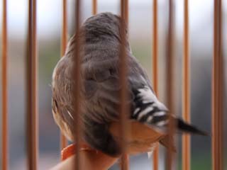巣立ちの日。 コイツも巣立ちの日は、部屋中を 飛び回って記念撮影出来ませんでした。(爆 ってなわけで、鳥カゴの中で 巣立ちの日の記念撮影♪ |